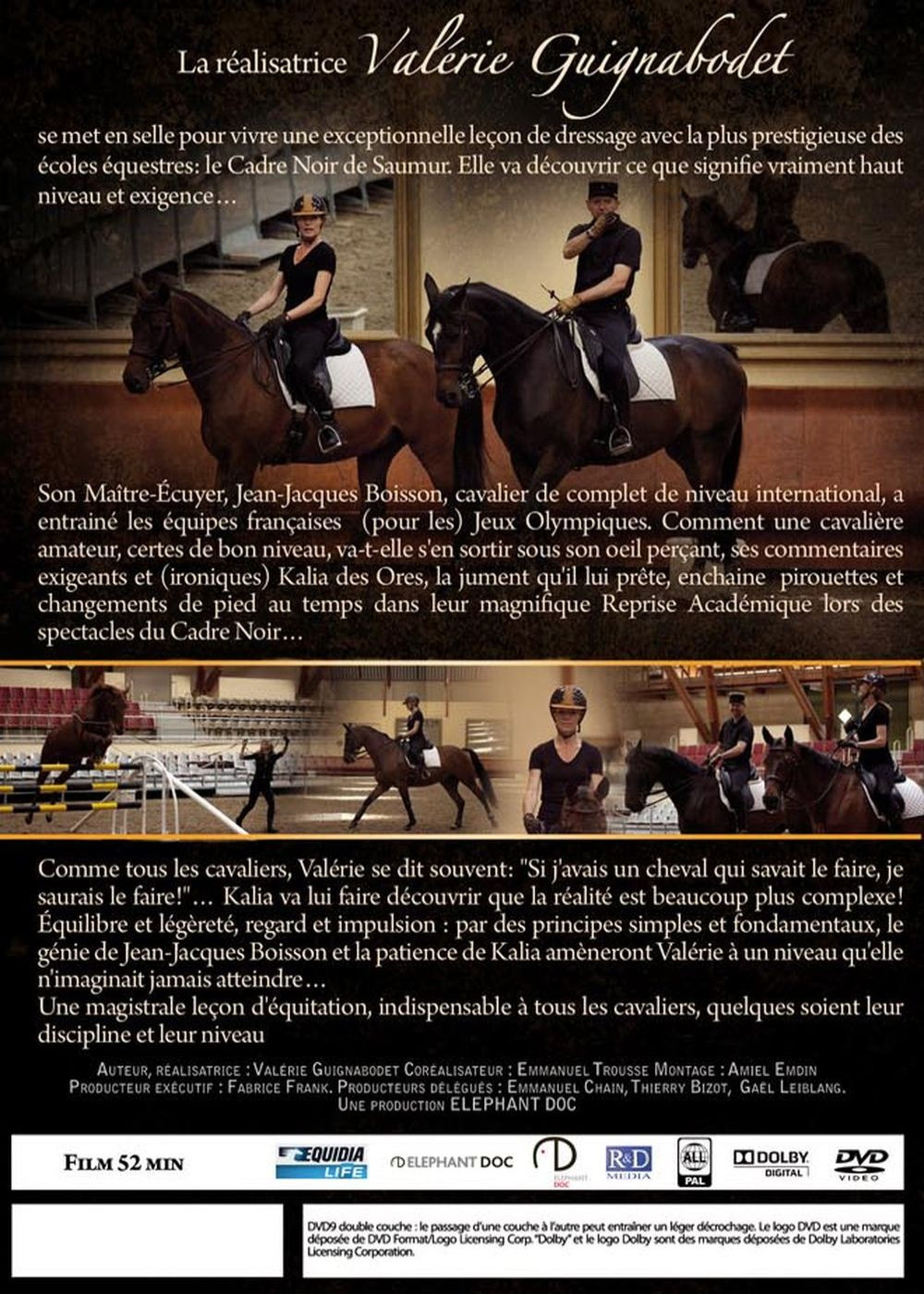 La réalisatrice Valérie Guignabodet se met en selle pour vivre une exceptionnelle leçon de dressage avec la plus prestigieuse des écoles équestres : le cadre noir de Saumur. Elle va découvrir ce que signifie vraiment haut niveau d'exigence... Son maître écuyer, Jean-Jacques Boisson, a entraîné les équipes françaises jusqu'aux Jeux Olympiques. Comment une cavalière amateur, certes de bon niveau, va-t-elle s'en sortir sous un oeil perçant, ses commentaires exigeants et ironiques ? Kalia des Ores, la jument qu'il lui prête, enchaîne pirouettes et changements de pied au temps dans leur magnifique Repise Académique lors des spectacles du Cadre Noir... Comme tous les cavaliers, Valérie se dit souvent : "Si j'avais un cheval qui savait faire, je saurais le faire !..." Kalia va lui découvrir que la réalité est beaucoup plus complexe ! Equilibre et légèreté, regard et impulsion : par des principes simples et fondamentaux, le génie de Jean-Jacques Boisson et la patience de Kalia amèneront Valérie à un niveau qu'elle n'imaginait jamais atteindre... Une magistrale leçon d'équitation, indispensable à tous les cavaliers, quels que soient leur discipline et leur niveau.