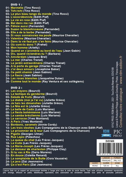 | > Distribution | Tino Rossi, Edith Piaf, Fernandel, Maurice Chevalier, Frehel, Arletty, Jean Gabin, Barbara, Jacques Brel, Charles Trenet, Josephine Baker, Jean Sablon, Jacqueline Dulac, Ray Ventura et ses collégiens, Bourvil, Juliette Gréco, Luis Mariano, Yves... |