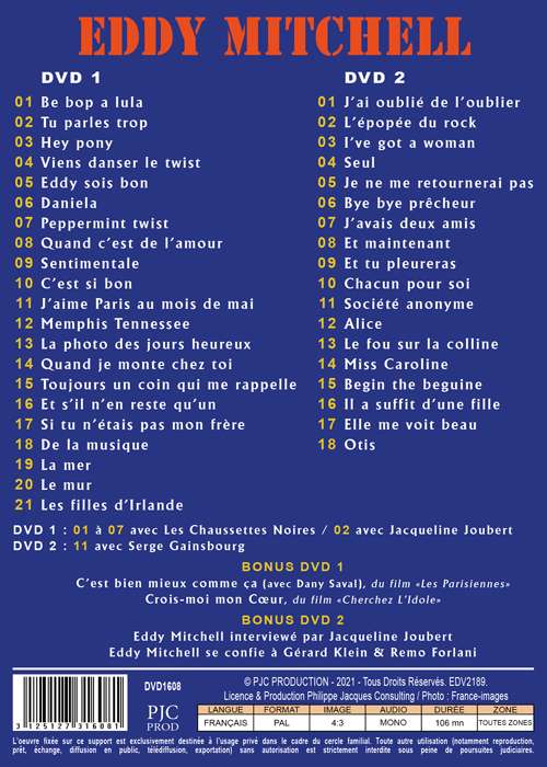 -- BONUS DVD 1 : - C'est bien mieux comme ça (avec Dany Saval), du film "Les Parisiennes" - Crois-moi mon coeur, du film "Cherchez l'idole" -- BONUS DVD 2 : - Eddy Mitchell interviewé par Jacqueline Joubert - Eddy Mitchell se confie à Gérard Klein & Remo Forlani